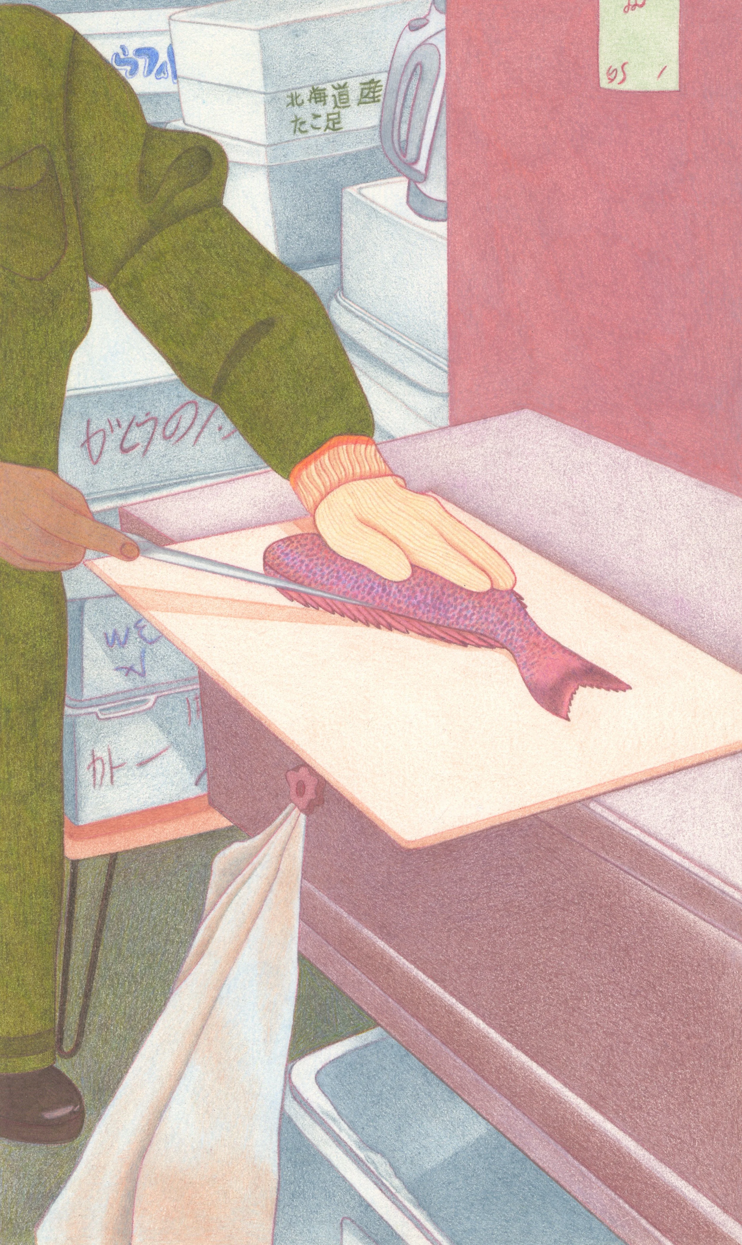 Toyosu with Toshi, 2024, colored pencil and marker on cotton paper, 6 x 10 inches