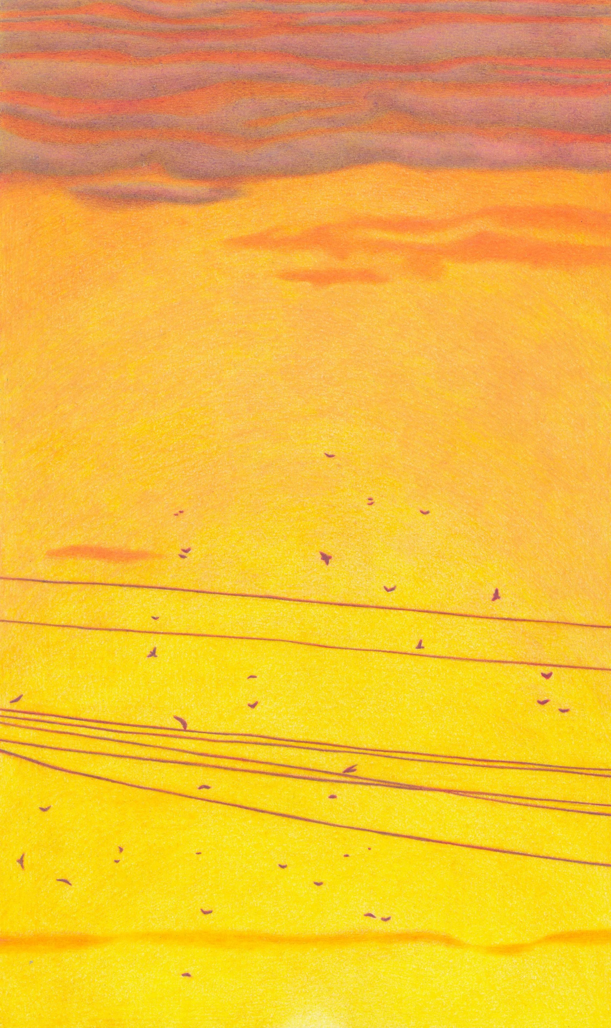 Crows on Dover Street, 2024, colored pencil on cotton paper, 6 x 10 inches