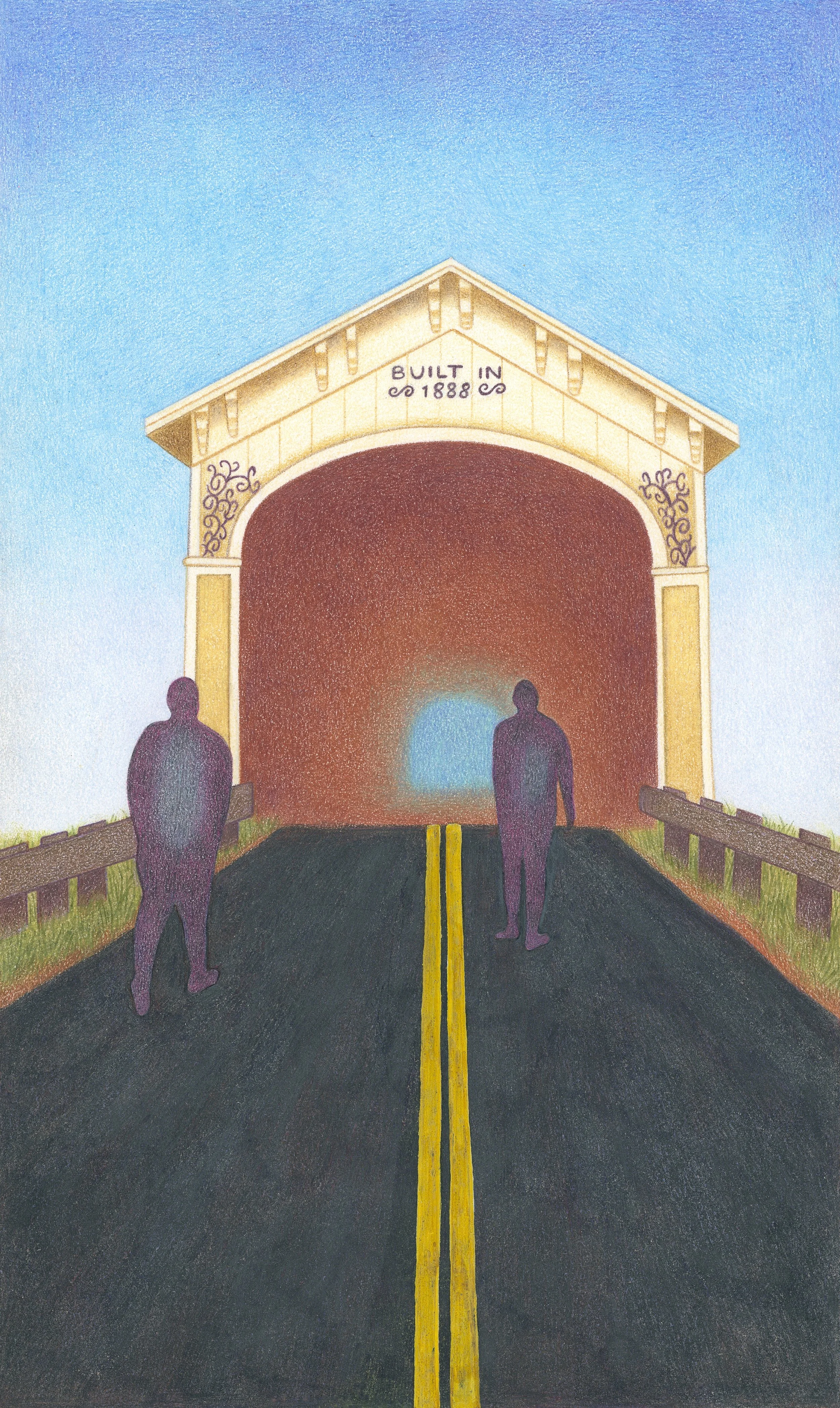 Covered Bridge, 2025, colored pencil, marker, and acrylic on cotton paper, 6 x 10 inches